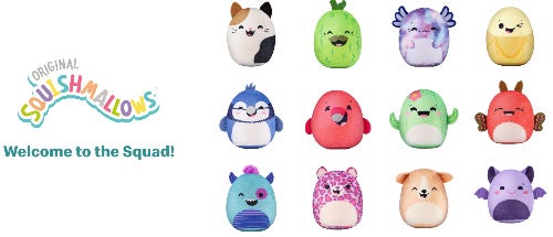 When I was at McDonald’s the other day stopping by for an ice cream cone I noticed on the menu the latest iteration of its Happy Meal for children. Along with a burger or chicken nuggets, apple slices, and a juice box, the meal includes one of 12 pocket-sized plush toys called Squishmallows, shown in the image below.